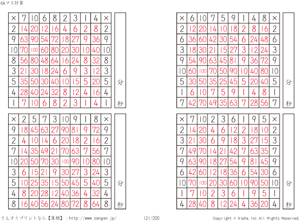 上記のボタンから「64ます掛け算(8マス×8マス)」の算数数学ドリル・計算ドリル(PDFプリント)がダウンロードできます。個人利用は無料です(家庭以外での配布は有料です)。