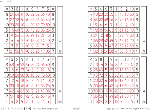 上記のボタンから「64ます掛け算(8マス×8マス)」の算数数学ドリル・計算ドリル(PDFプリント)がダウンロードできます。個人利用は無料です(家庭以外での配布は有料です)。
