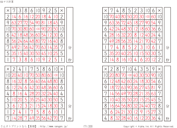 上記のボタンから「64ます掛け算(8マス×8マス)」の算数数学ドリル・計算ドリル(PDFプリント)がダウンロードできます。個人利用は無料です(家庭以外での配布は有料です)。