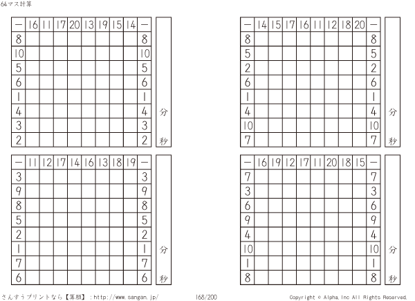 上記のボタンから「64ます引き算(8マス×8マス)」の算数数学ドリル・計算ドリル(PDFプリント)がダウンロードできます。個人利用は無料です(家庭以外での配布は有料です)。
