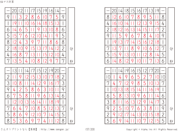 上記のボタンから「64ます引き算(8マス×8マス)」の算数数学ドリル・計算ドリル(PDFプリント)がダウンロードできます。個人利用は無料です(家庭以外での配布は有料です)。