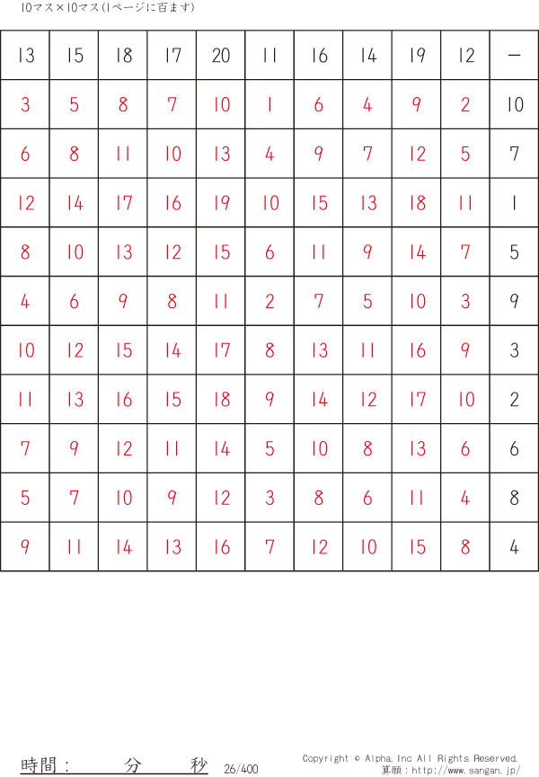 10×10ます引き算(100マス)-左利き用- [解答]026/400