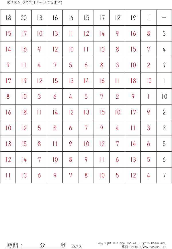 10×10ます引き算(100マス)-左利き用- [解答]032/400
