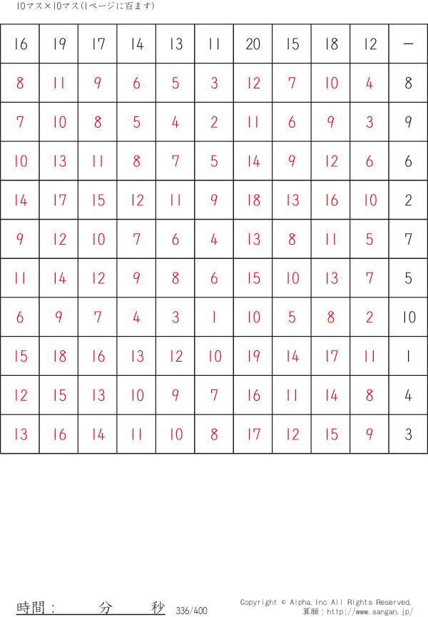 10×10ます引き算(100マス)-左利き用- [解答]336/400
