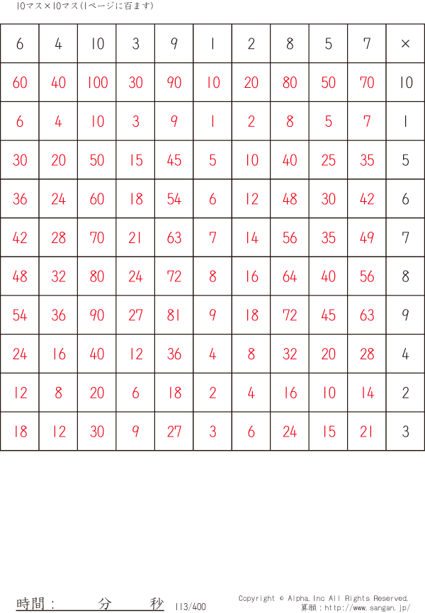 10×10ます掛け算(100マス)-左利き用- [解答]113/400