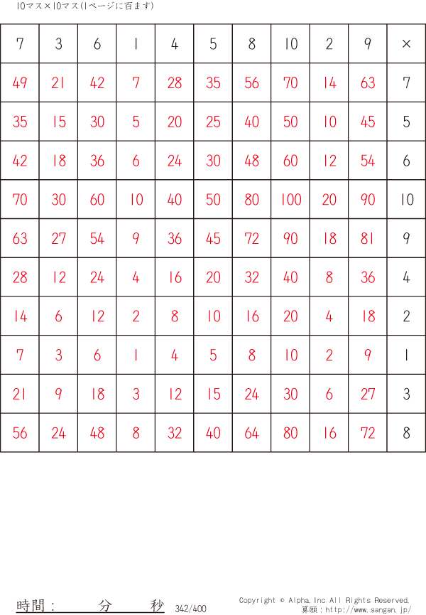 10×10ます掛け算(100マス)-左利き用- [解答]342/400
