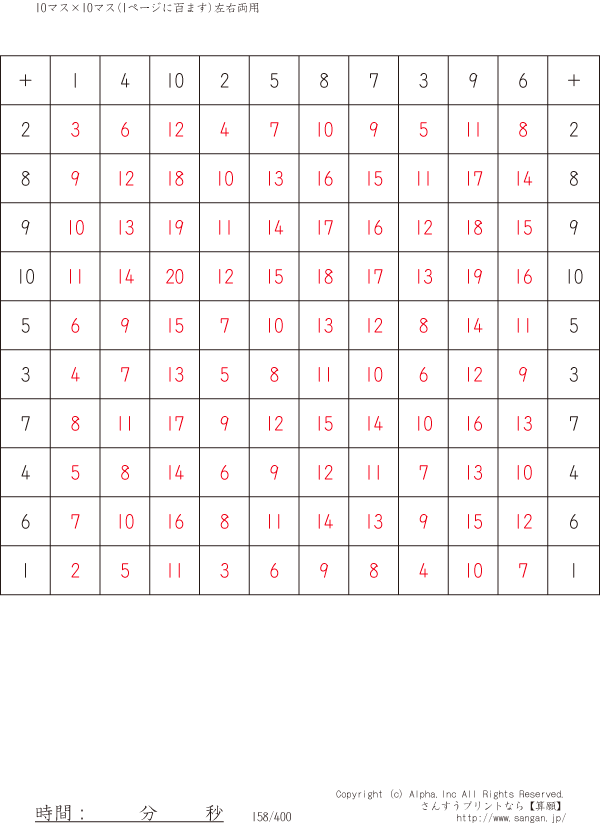 10×10ます足し算(100マス)-左右両用- [解答]158/400