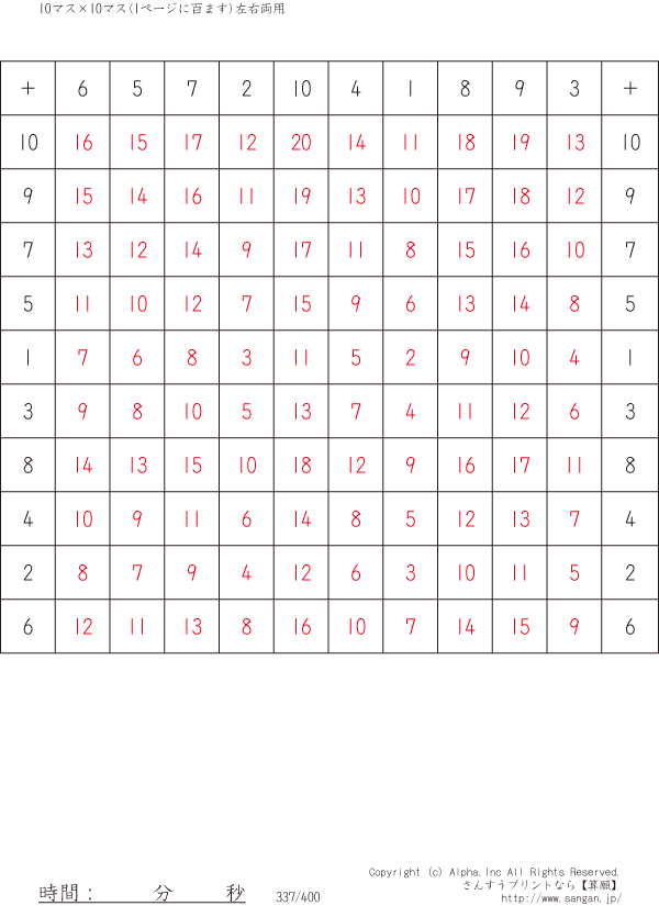 10×10ます足し算(100マス)-左右両用- [解答]337/400