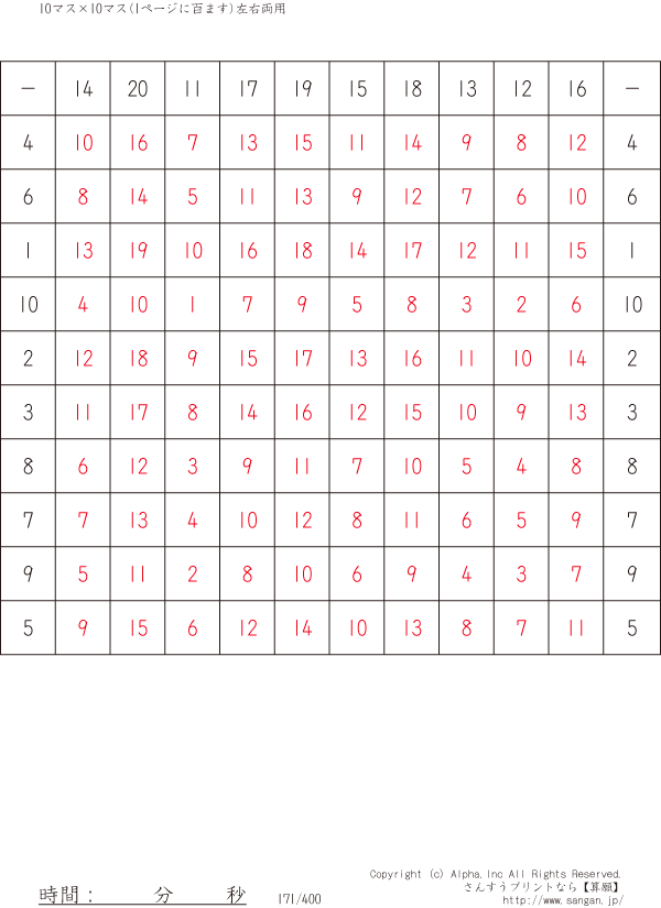 10×10ます引き算(100マス)-左右両用- [解答]171/400