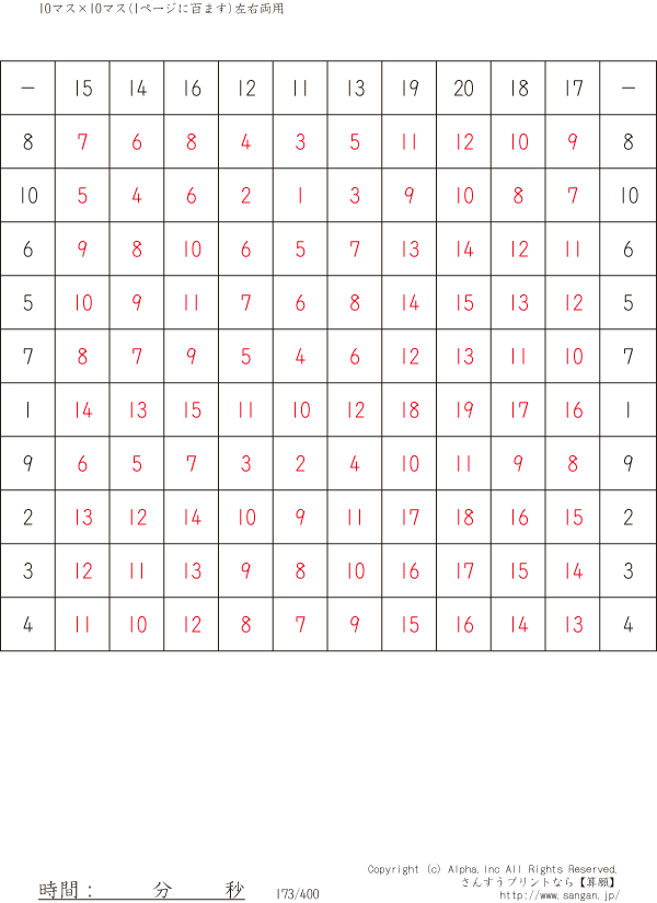 10×10ます引き算(100マス)-左右両用- [解答]173/400