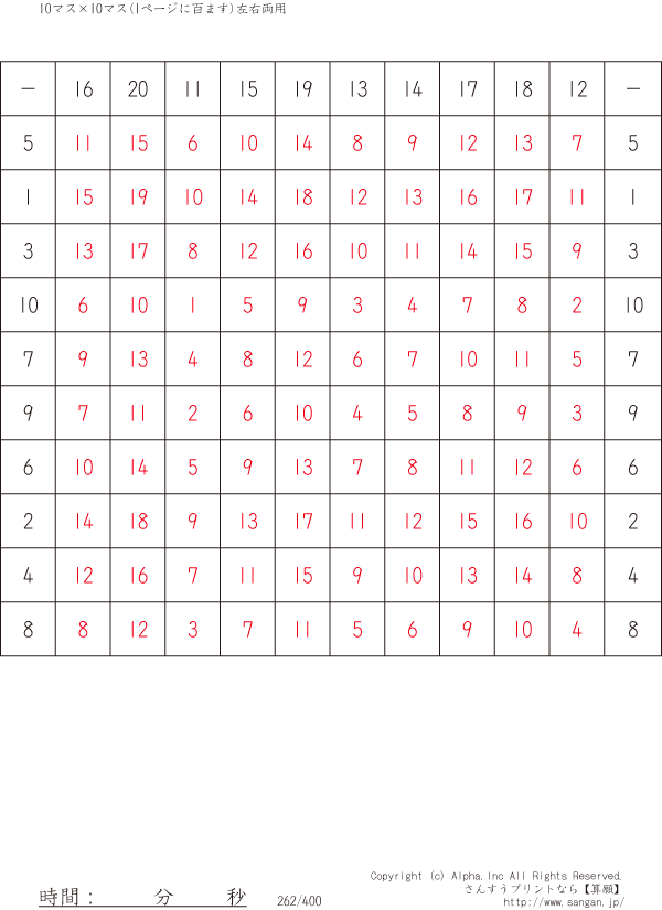 10×10ます引き算(100マス)-左右両用- [解答]262/400