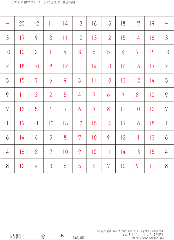 10×10ます引き算(100マス)-左右両用- [解答]342/400