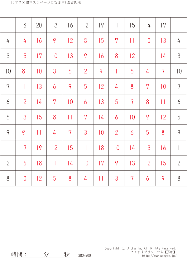 10×10ます引き算(100マス)-左右両用- [解答]380/400