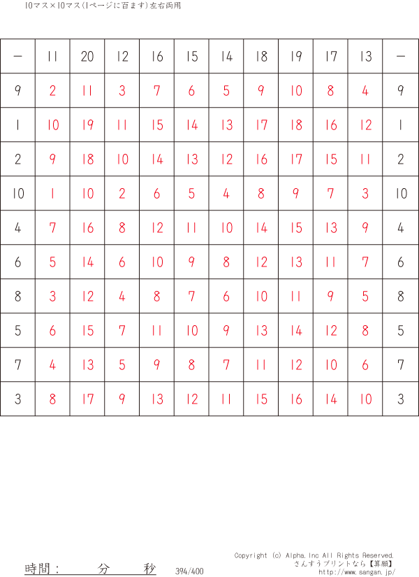 10×10ます引き算(100マス)-左右両用- [解答]394/400