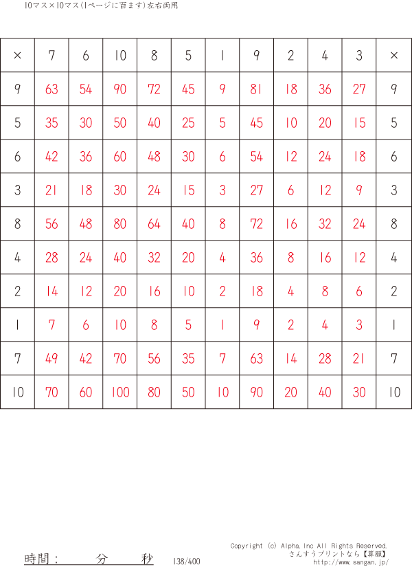 10×10ます掛け算(100マス)-左右両用- [解答]138/400