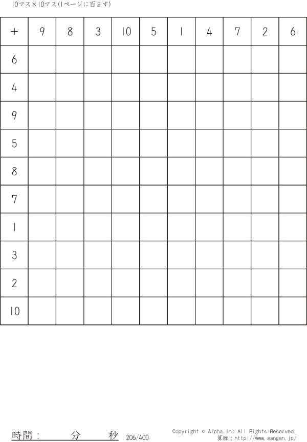 上記のボタンから「10×10ます足算(100マス)」の算数数学ドリル・計算ドリル(PDFプリント)がダウンロードできます。個人利用は無料です(家庭以外での配布は有料です)。