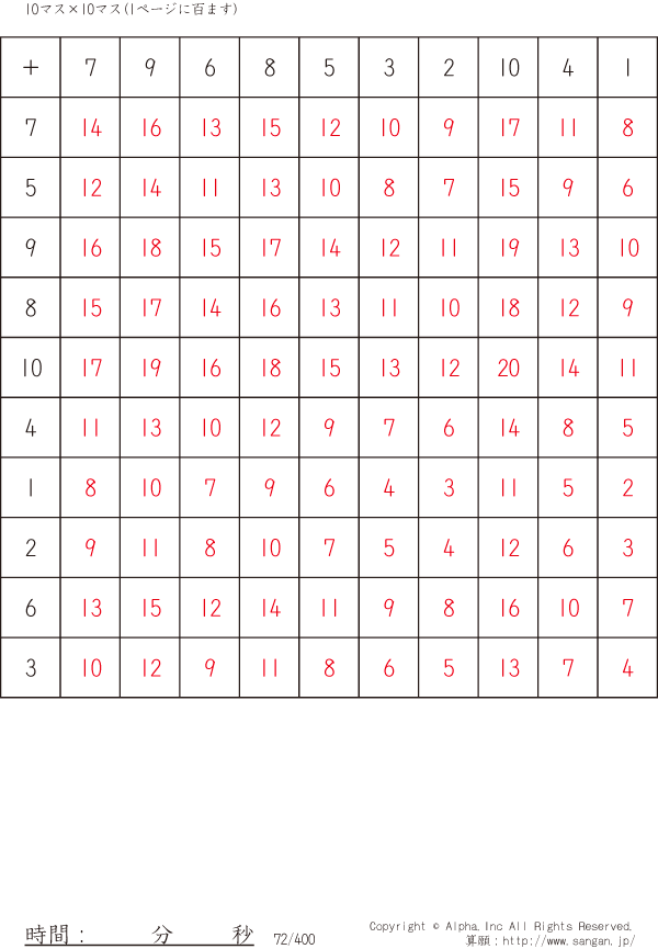 上記のボタンから「10×10ます足算(100マス)」の算数数学ドリル・計算ドリル(PDFプリント)がダウンロードできます。個人利用は無料です(家庭以外での配布は有料です)。