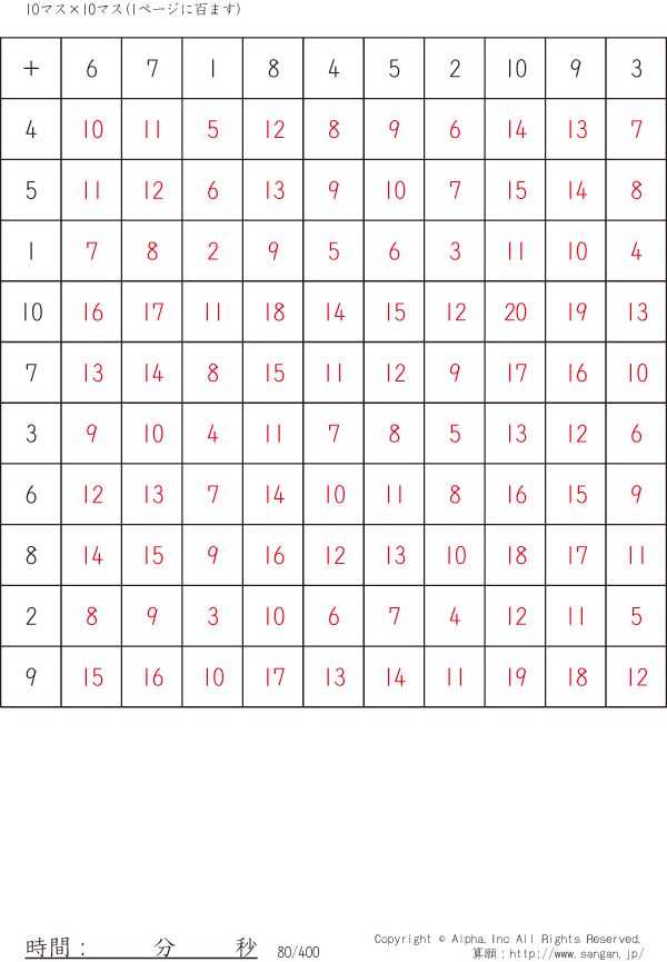 上記のボタンから「10×10ます足算(100マス)」の算数数学ドリル・計算ドリル(PDFプリント)がダウンロードできます。個人利用は無料です(家庭以外での配布は有料です)。