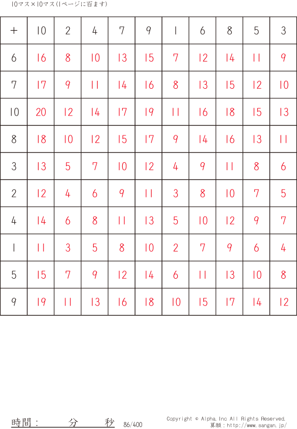 10×10ます足算(100マス) [解答]086/400