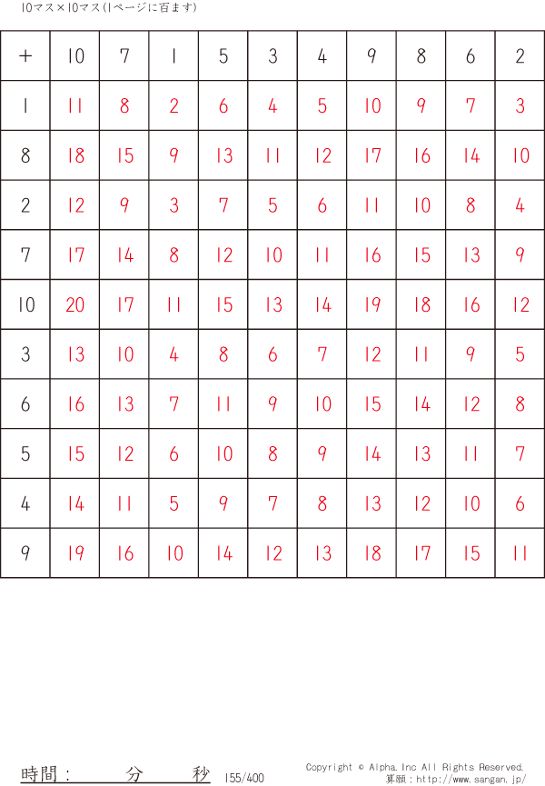 上記のボタンから「10×10ます足算(100マス)」の算数数学ドリル・計算ドリル(PDFプリント)がダウンロードできます。個人利用は無料です(家庭以外での配布は有料です)。