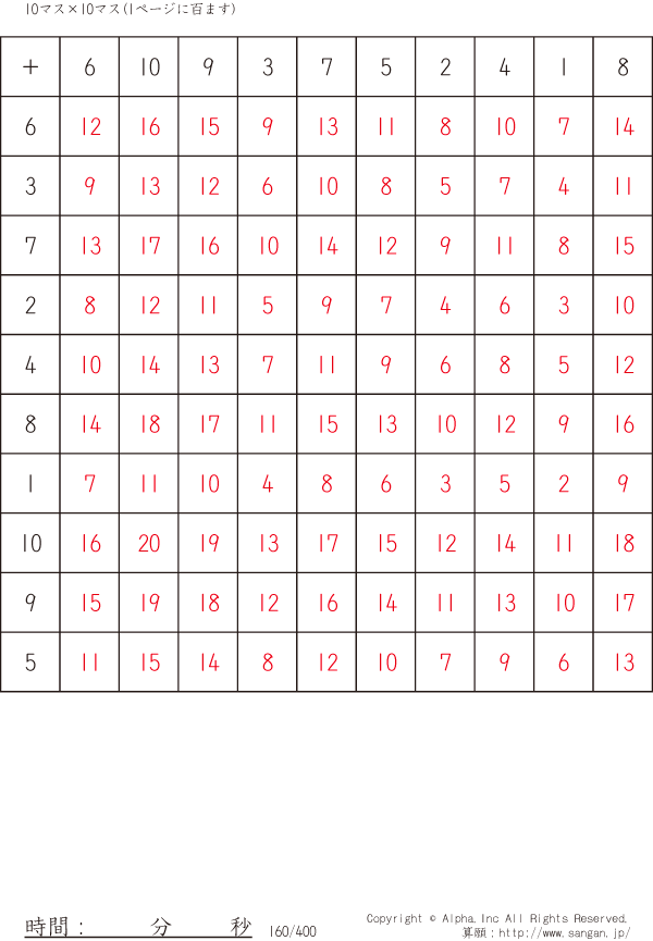 上記のボタンから「10×10ます足算(100マス)」の算数数学ドリル・計算ドリル(PDFプリント)がダウンロードできます。個人利用は無料です(家庭以外での配布は有料です)。