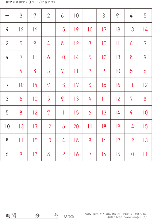 上記のボタンから「10×10ます足算(100マス)」の算数数学ドリル・計算ドリル(PDFプリント)がダウンロードできます。個人利用は無料です(家庭以外での配布は有料です)。