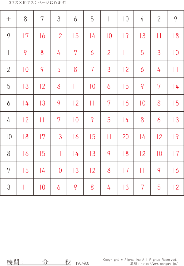10×10ます足算(100マス) [解答]190/400