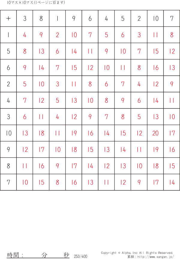 上記のボタンから「10×10ます足算(100マス)」の算数数学ドリル・計算ドリル(PDFプリント)がダウンロードできます。個人利用は無料です(家庭以外での配布は有料です)。