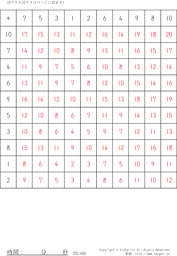 上記のボタンから「10×10ます足算(100マス)」の算数数学ドリル・計算ドリル(PDFプリント)がダウンロードできます。個人利用は無料です(家庭以外での配布は有料です)。