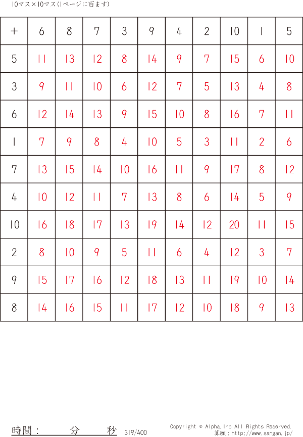 10×10ます足算(100マス) [解答]319/400