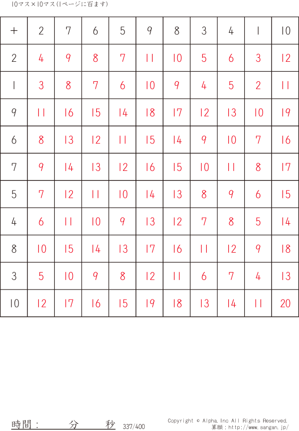 上記のボタンから「10×10ます足算(100マス)」の算数数学ドリル・計算ドリル(PDFプリント)がダウンロードできます。個人利用は無料です(家庭以外での配布は有料です)。