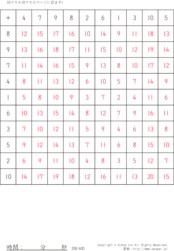 10×10ます足算(100マス) [解答]358/400