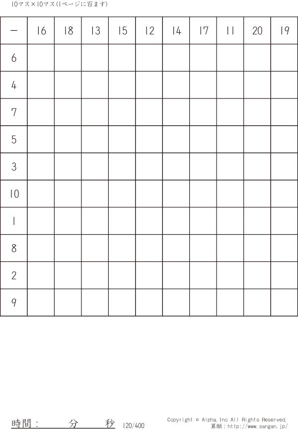 上記のボタンから「10×10ます引き算(100マス)」の算数数学ドリル・計算ドリル(PDFプリント)がダウンロードできます。個人利用は無料です(家庭以外での配布は有料です)。