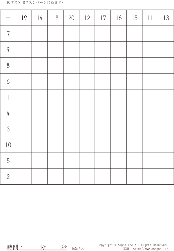 上記のボタンから「10×10ます引き算(100マス)」の算数数学ドリル・計算ドリル(PDFプリント)がダウンロードできます。個人利用は無料です(家庭以外での配布は有料です)。