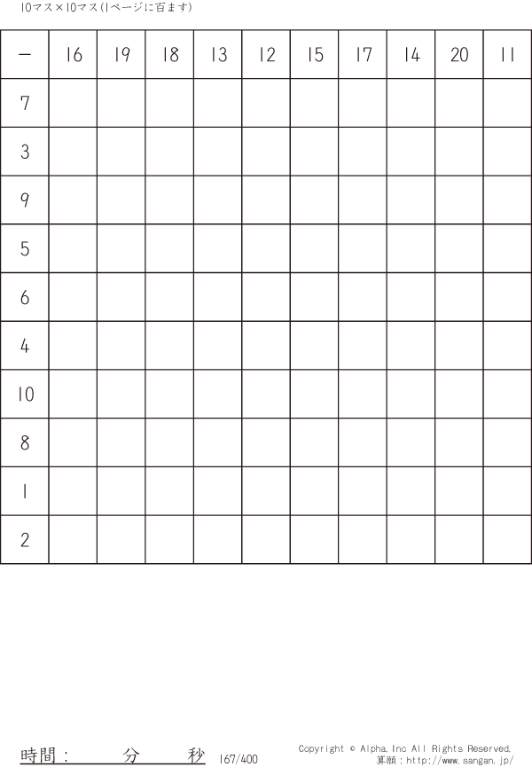 上記のボタンから「10×10ます引き算(100マス)」の算数数学ドリル・計算ドリル(PDFプリント)がダウンロードできます。個人利用は無料です(家庭以外での配布は有料です)。