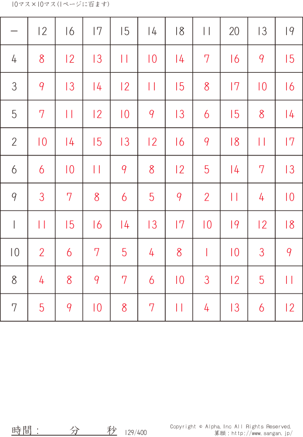 上記のボタンから「10×10ます引き算(100マス)」の算数数学ドリル・計算ドリル(PDFプリント)がダウンロードできます。個人利用は無料です(家庭以外での配布は有料です)。