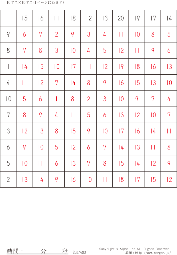 上記のボタンから「10×10ます引き算(100マス)」の算数数学ドリル・計算ドリル(PDFプリント)がダウンロードできます。個人利用は無料です(家庭以外での配布は有料です)。
