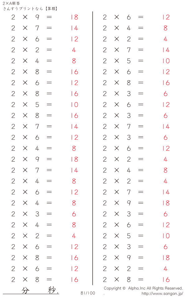 算数計算問題 2×AのPDFプリント [解答]081/100