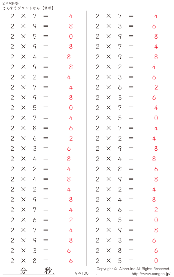 算数計算問題 2×AのPDFプリント [解答]099/100