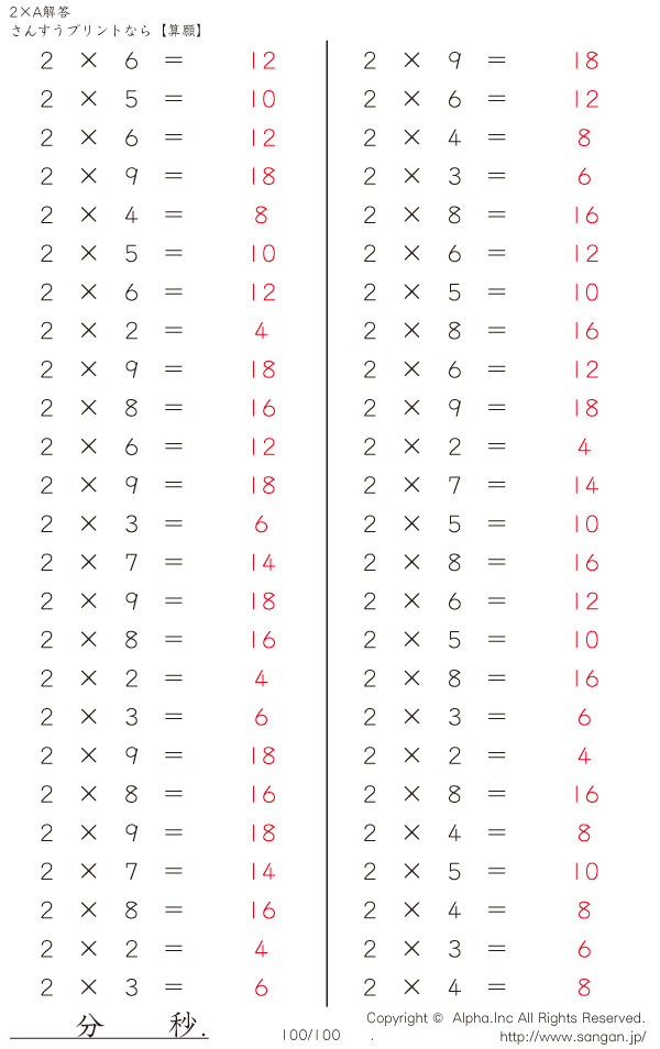 算数計算問題 2×AのPDFプリント [解答]100/100