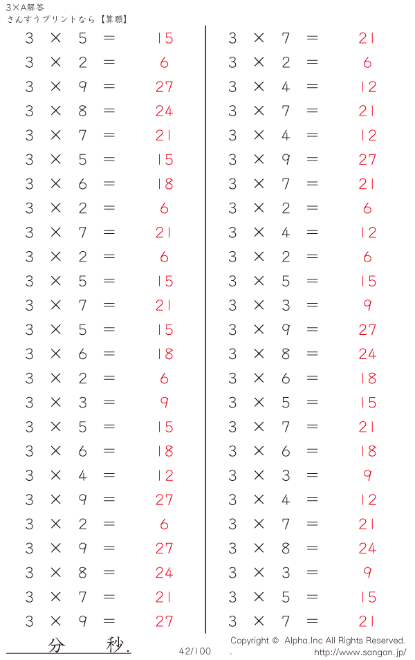 算数計算問題 3×AのPDFプリント [解答]042/100