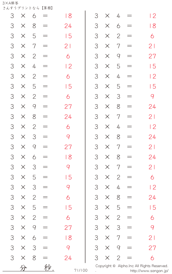 算数計算問題 3×AのPDFプリント [解答]071/100