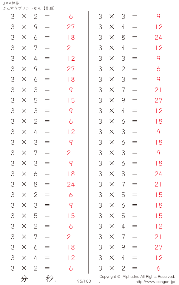 算数計算問題 3×AのPDFプリント [解答]095/100
