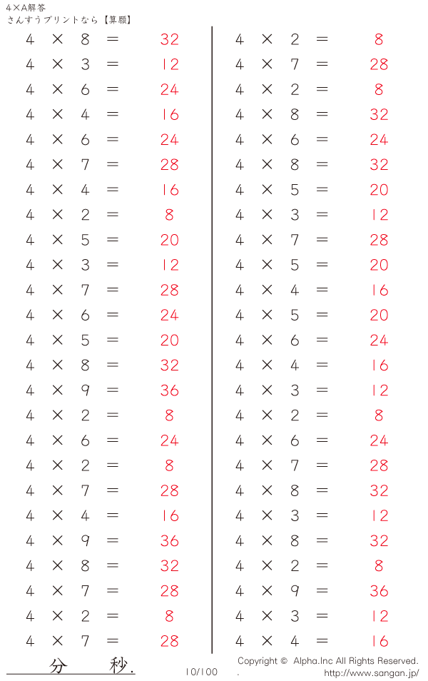 算数計算問題 4×AのPDFプリント [解答]010/100