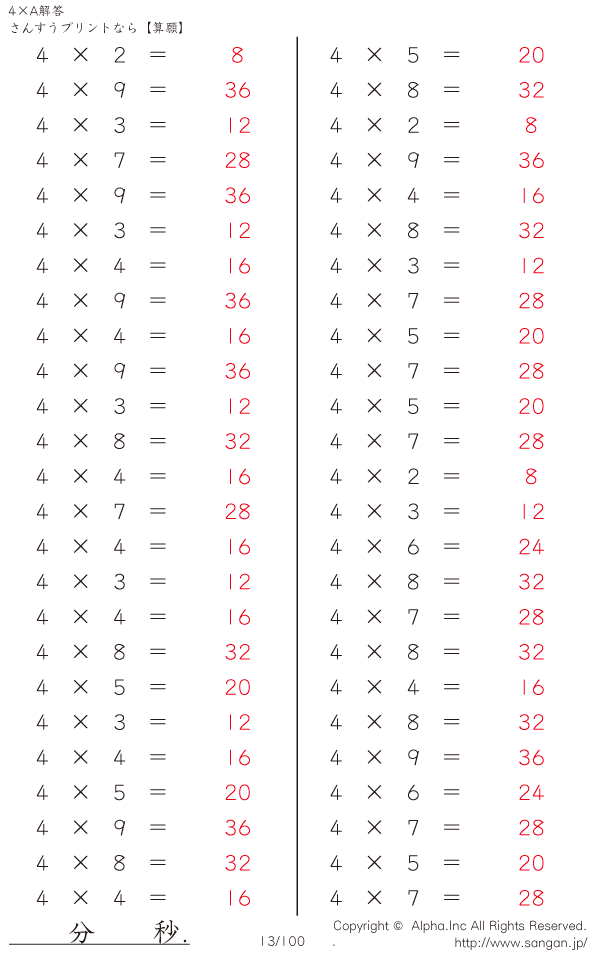 算数計算問題 4×AのPDFプリント [解答]013/100