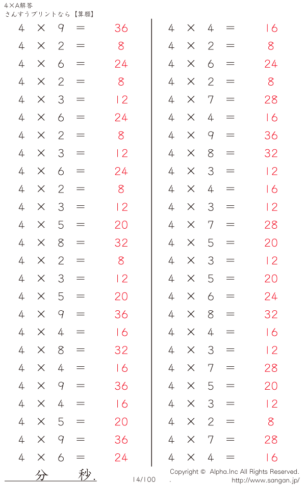 算数計算問題 4×AのPDFプリント [解答]014/100