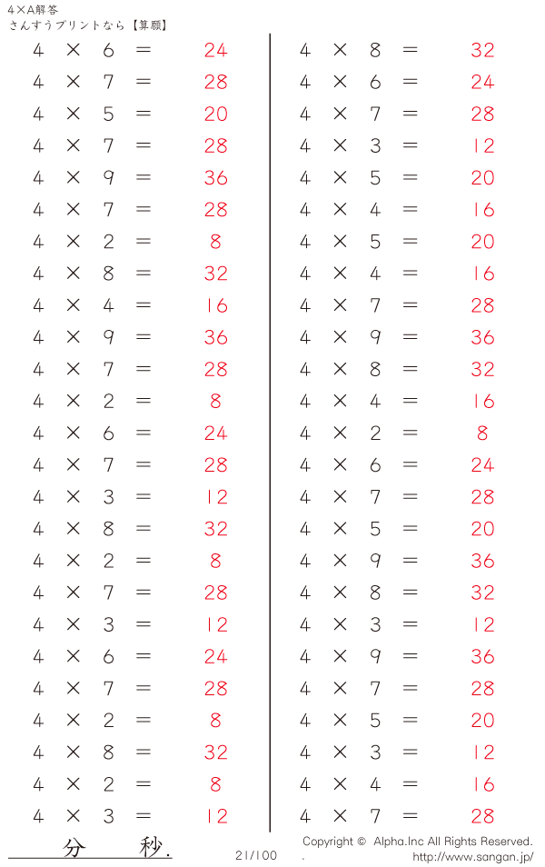算数計算問題 4×AのPDFプリント [解答]021/100