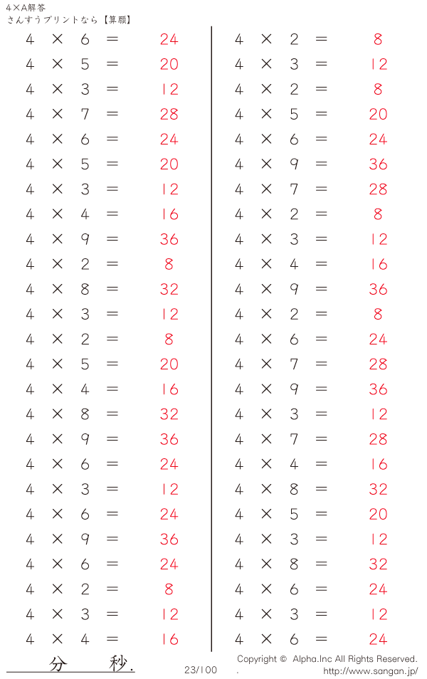 算数計算問題 4×AのPDFプリント [解答]023/100