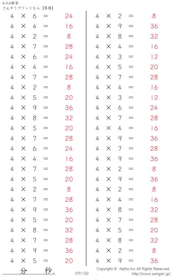 算数計算問題 4×AのPDFプリント [解答]029/100