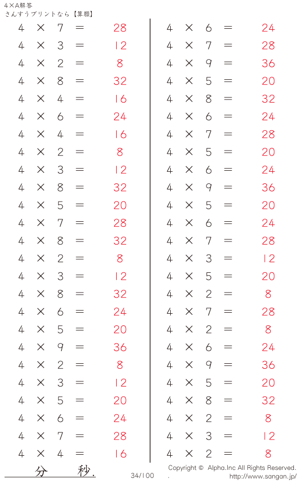 算数計算問題 4×AのPDFプリント [解答]034/100